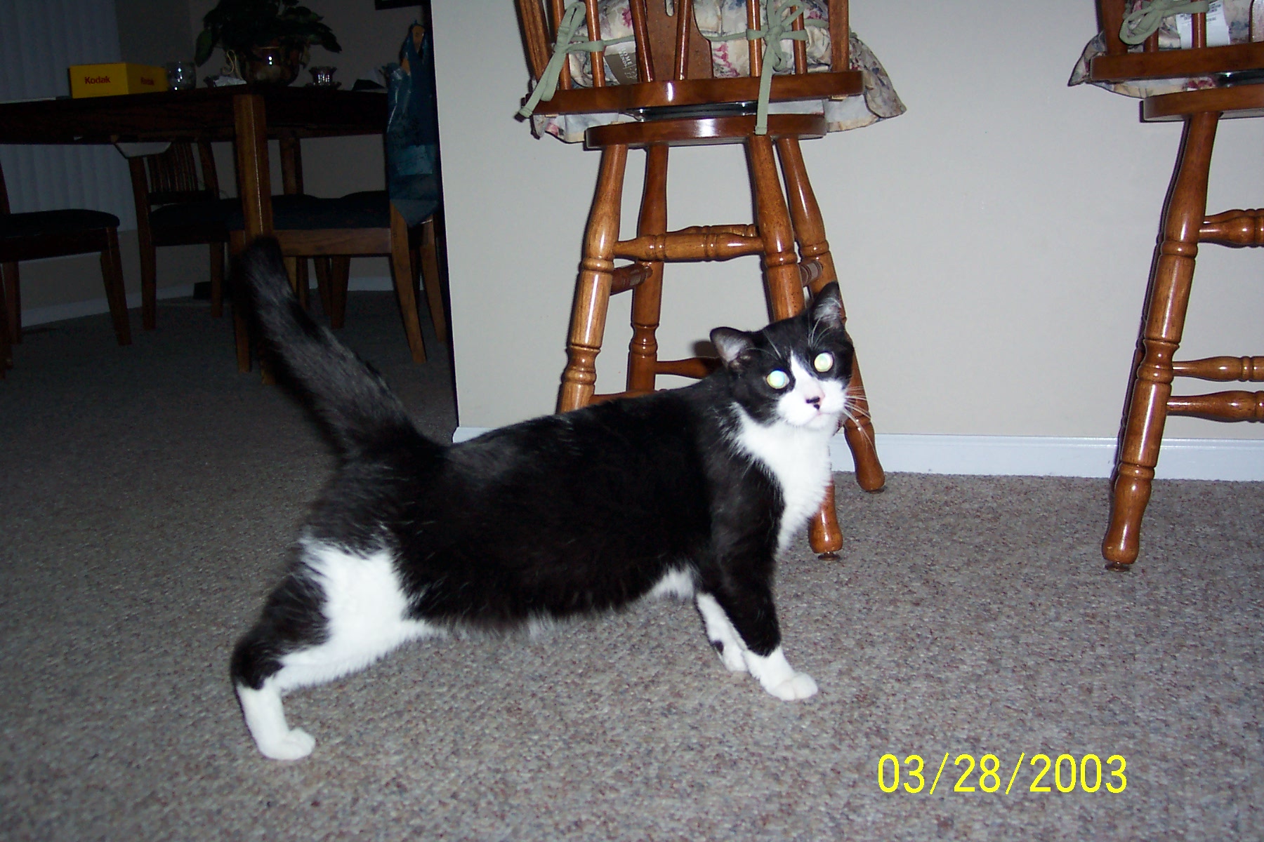 Here is the second picture taken with that camera–Charlie (with frickin’ laser beams shooting out his eyes), same table, same Kodak box.