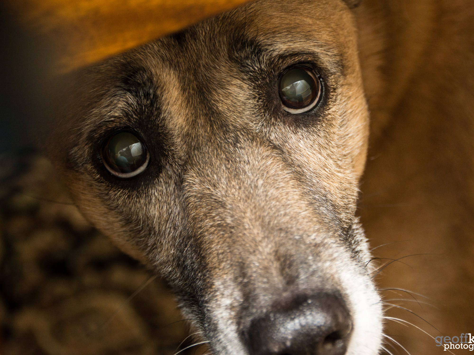 Lucy came to live with us in 2003. I’ve got dozens if not hundreds of pictures of this dog, any number of which probably don’t have a blurry strap falling across the lens. But this is one of my favorites, because everything you’d ever need to know about this dog, you can see in her eyes here.